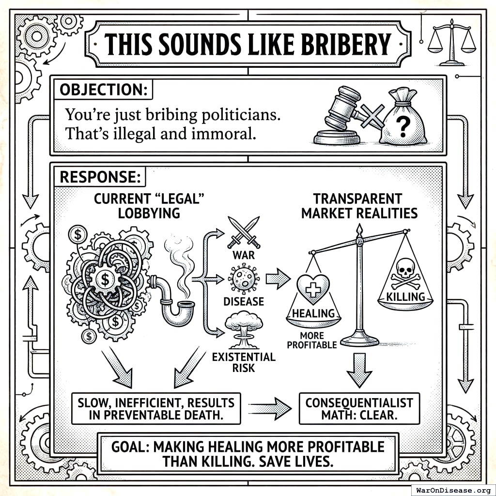 The military-industrial complex spends $127M (95% CI: $100M-$160M) yearly on lobbyists. You can’t beat them with moral arguments (they’re immune; moral arguments have a $0 budget and no K Street address). Beat them at their own game. Raise $1B through VICTORY Incentive Alignment Bonds145. Allocate $650M for lobbying. That overwhelms the defense industry’s $127M (95% CI: $100M-$160M) spend. Go to the same K Street firms. Outbid them. Lobbyists work for the highest bidder. They always have. This is the one area where your species’ mercenary instincts are genuinely helpful.