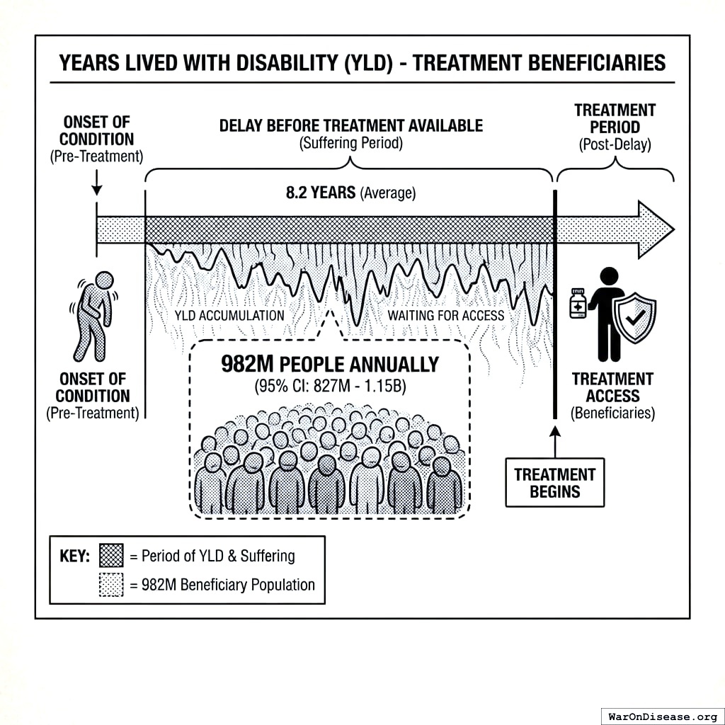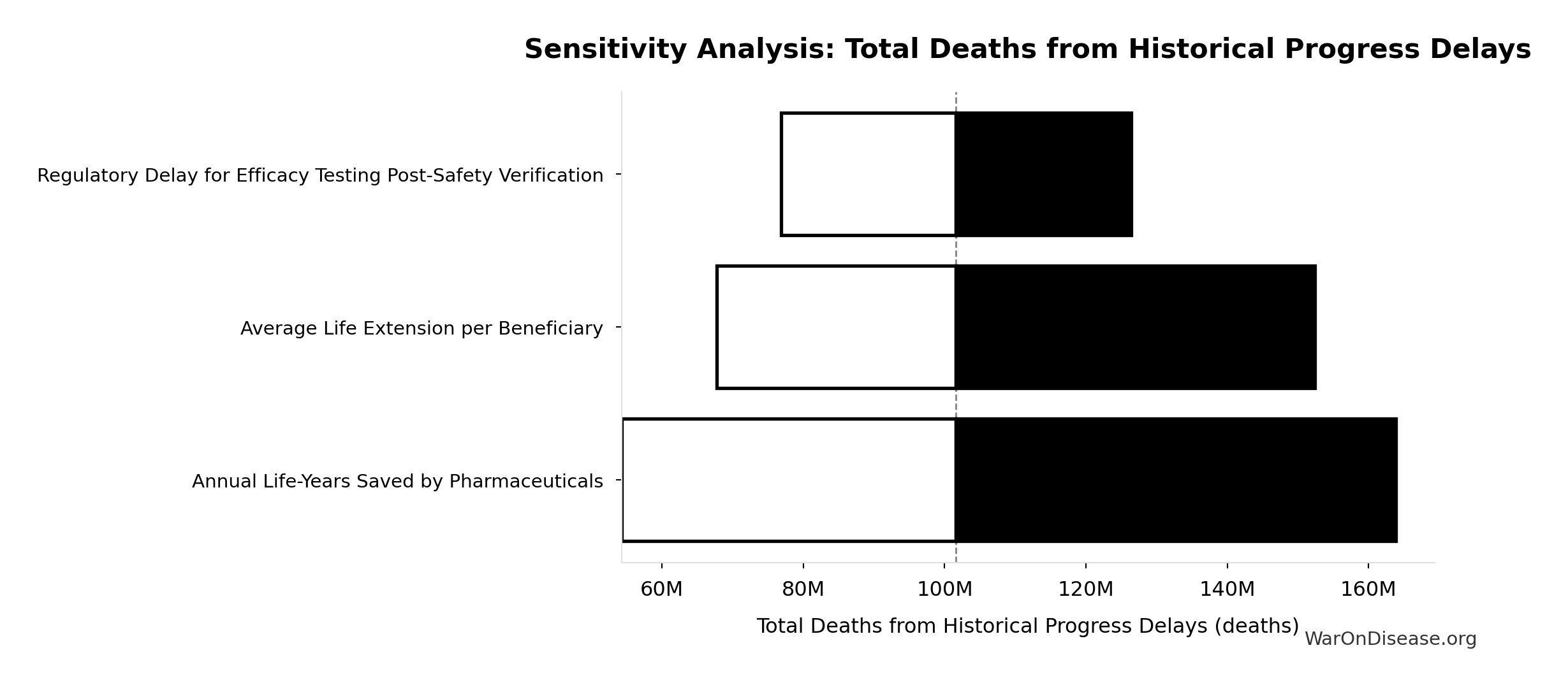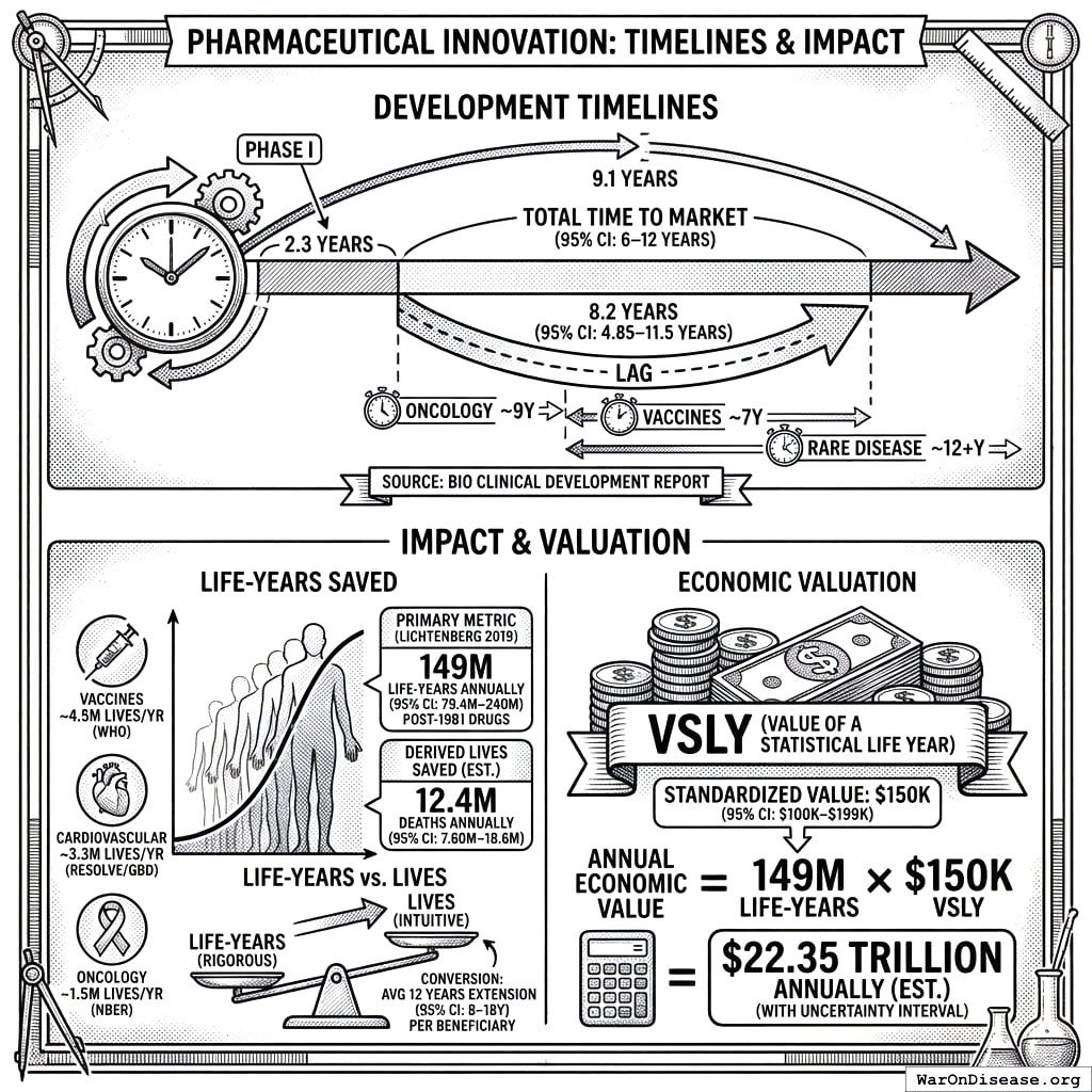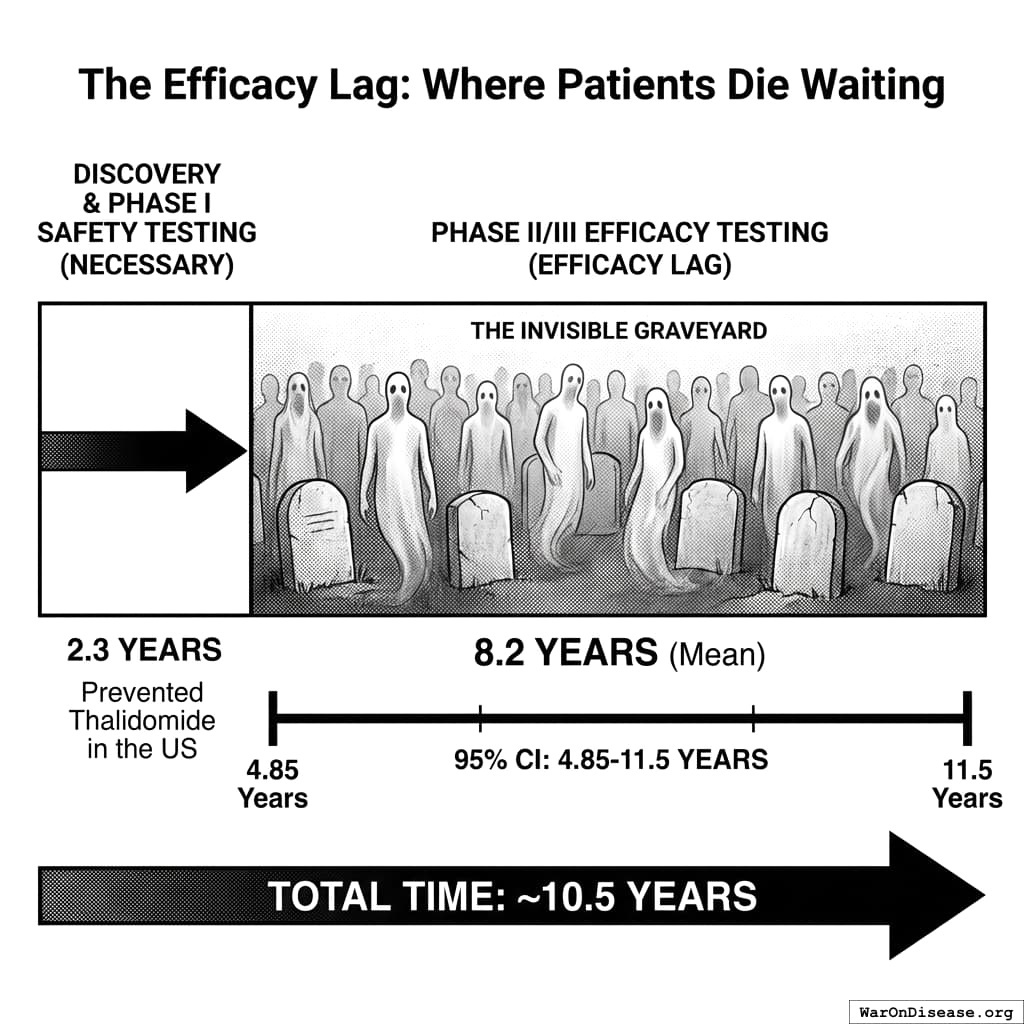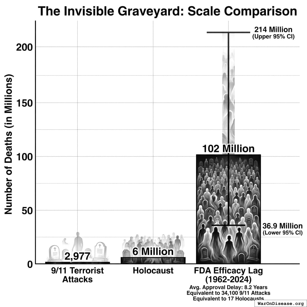 1. Historical mortality (1962-2024): Approximately 102 million deaths (95% CI: 36.9 million deaths-214 million deaths) died waiting for approved drugs during their 8.2 years (95% CI: 4.85 years-11.5 years) approval delays. This is a lower bound - it excludes drugs never developed due to cost barriers.