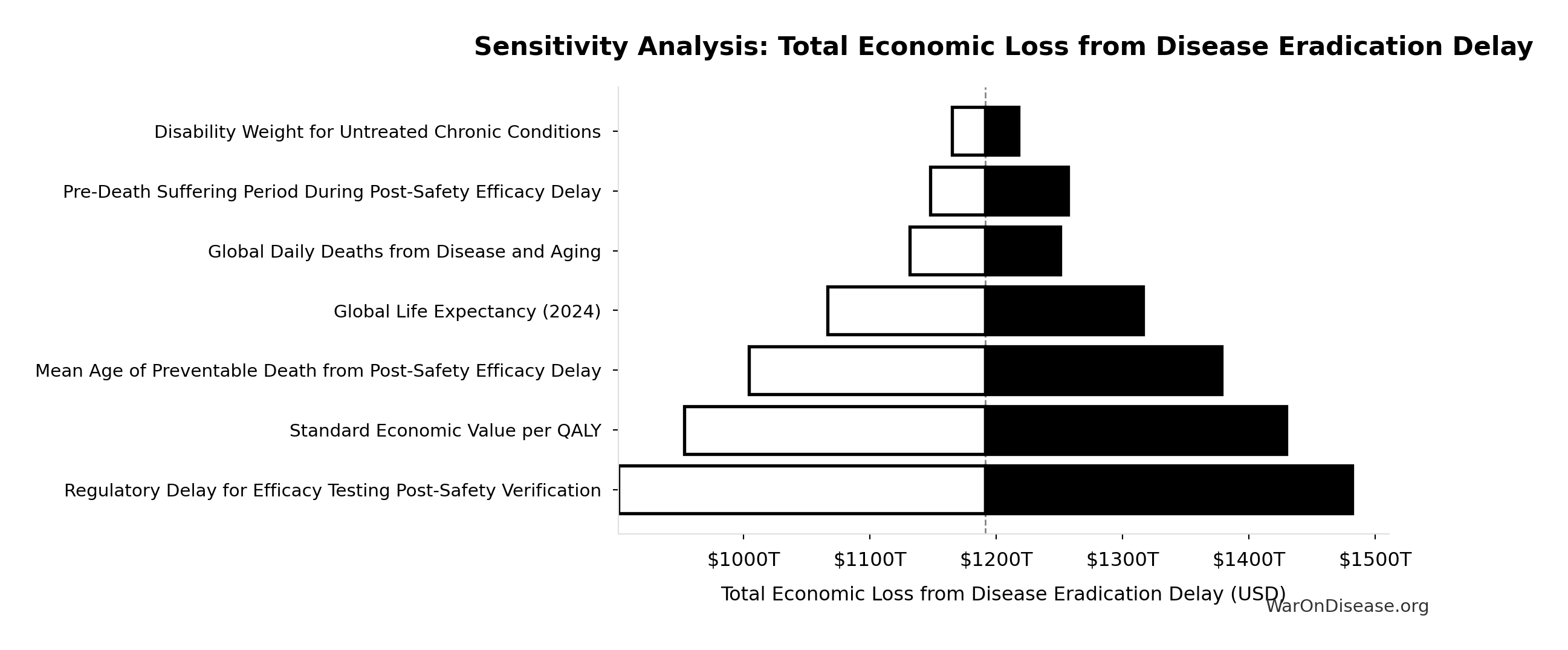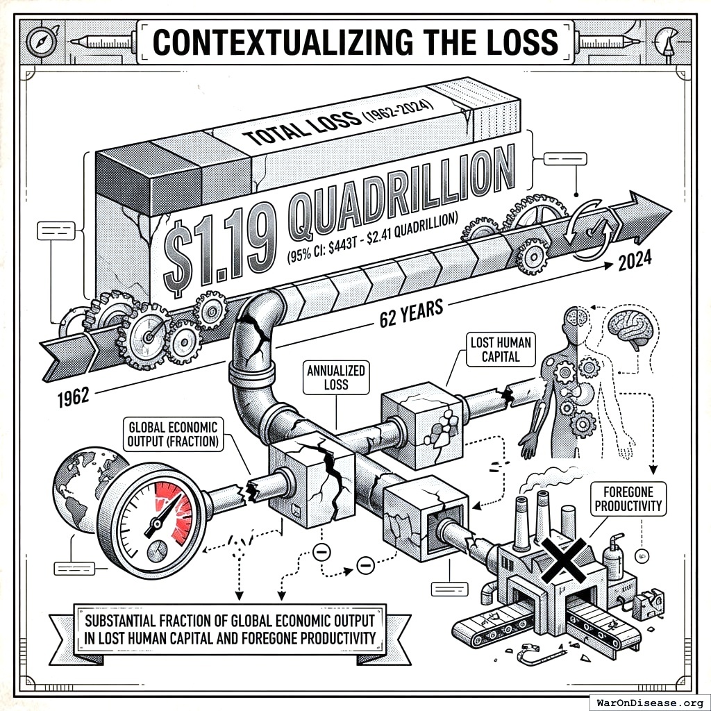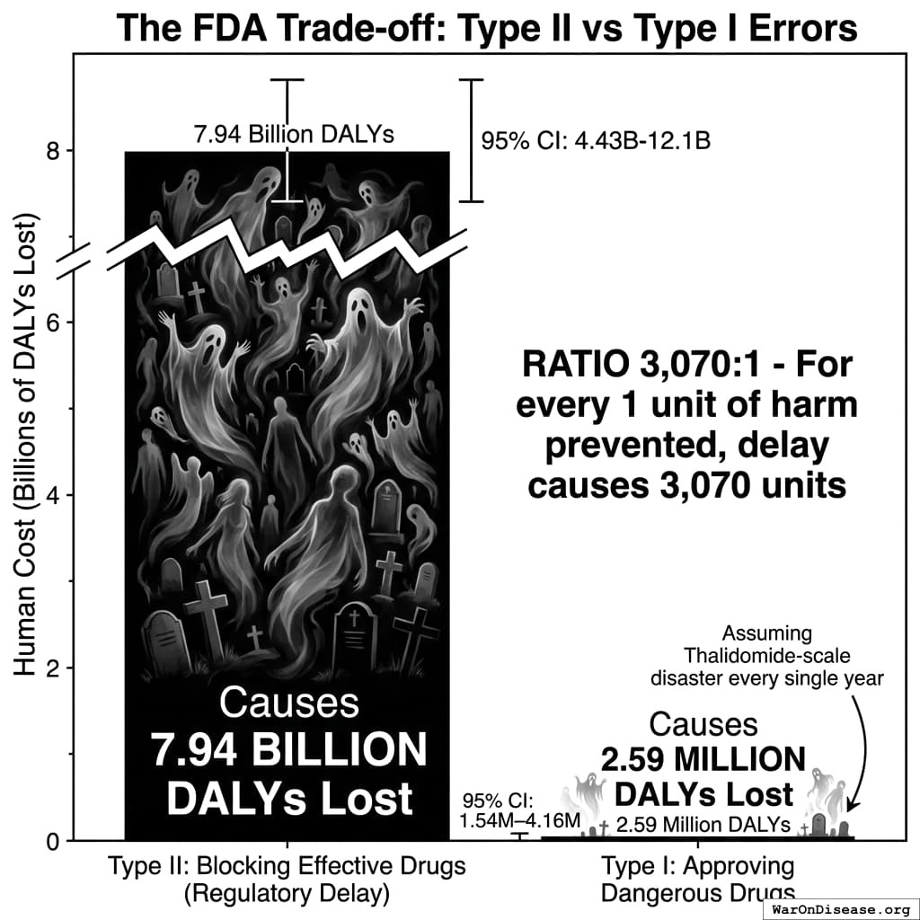 Valuing these lost years at a conservative global Value of a Statistical Life Year (VSLY) of $150K (95% CI: $100K-$199K)/DALY (the standard normative valuation used in WHO and health economics cost-effectiveness analyses), we find a cumulative economic deadweight loss of approximately $1.19 quadrillion (95% CI: $443T-$2.41 quadrillion) (2024 USD). The study concludes that the societal cost of Type II Regulatory Errors (delayed access to effective therapies) exceeds the averted cost of Type I Regulatory Errors (market access for ineffective therapies) by a factor of 3.07k (95% CI: 2.88k-3.12k).