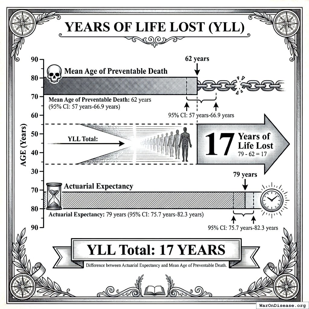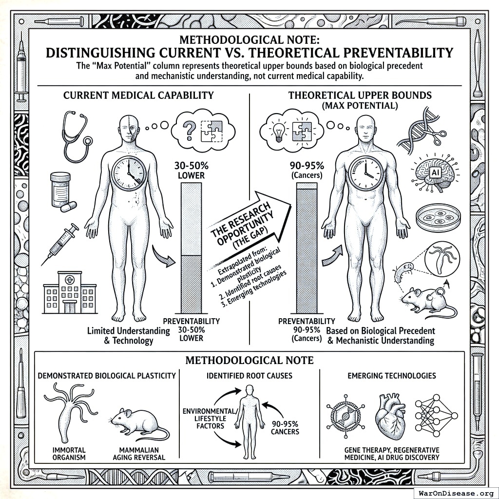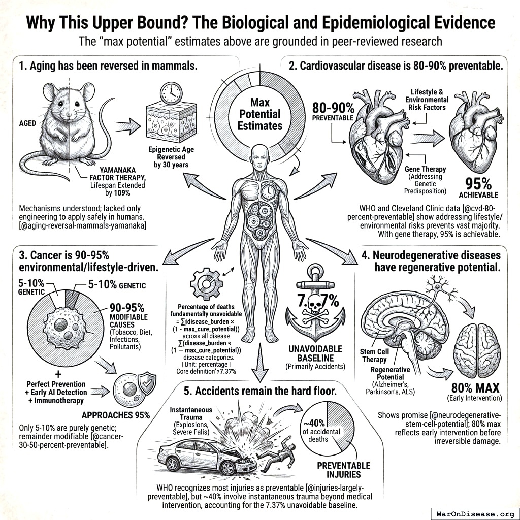 Note: The PRIMARY estimate uses global disease mortality rates, not the 92.6% (95% CI: 50%-98%) ceiling. This upper bound provides context for the theoretical maximum scenario.