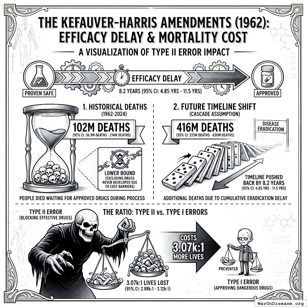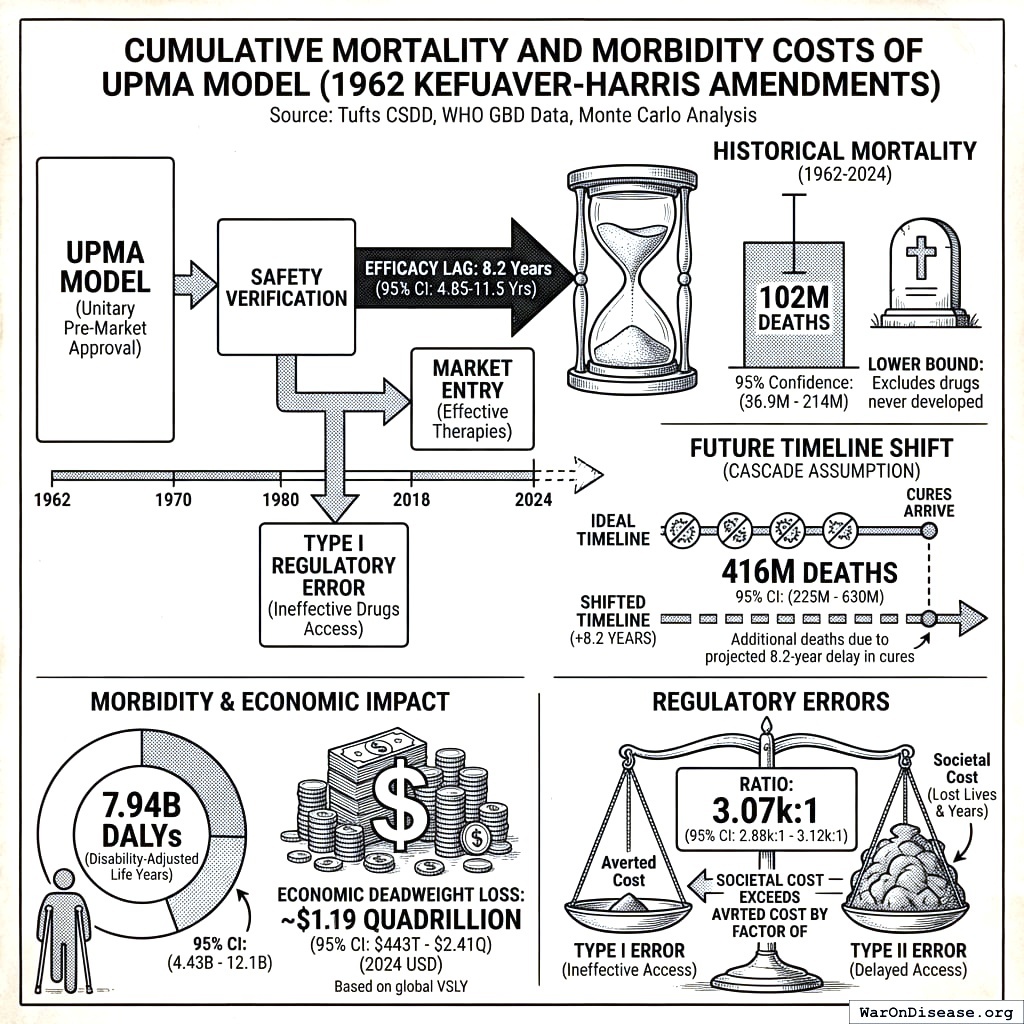 This study quantifies the cumulative mortality and morbidity costs associated with the Unitary Pre-Market Approval (UPMA) model mandated by the 1962 Kefauver-Harris Amendments. By enforcing efficacy testing prior to market entry, the current regulatory framework imposes an average “Efficacy Lag” of 8.2 years (95% CI: 4.85 years-11.5 years) post-safety verification. Using data from the Tufts Center for the Study of Drug Development (CSDD) and the WHO Global Burden of Disease (GBD) database, we estimate two distinct mortality costs: (1) Historical mortality (1962-2024): approximately 102 million deaths (95% CI: 36.9 million deaths-214 million deaths) died waiting for approved drugs during their approval delays, representing a lower bound excluding drugs never developed due to cost barriers; (2) Future timeline shift: an additional 416 million deaths (95% CI: 225 million deaths-630 million deaths) will eventually die because the disease eradication timeline has been pushed back by 8.2 years (95% CI: 4.85 years-11.5 years). Combined, these represent 7.94 billion (95% CI: 4.43 billion-12.1 billion) Disability-Adjusted Life Years when adjusted for morbidity, with a cumulative economic deadweight loss of approximately $1.19 quadrillion (95% CI: $443T-$2.41 quadrillion) (2024 USD), reflecting 7.94 billion (95% CI: 4.43 billion-12.1 billion) DALYs valued at the standard WHO cost-effectiveness threshold of $150K (95% CI: $100K-$199K)/DALY. The societal cost of Type II Regulatory Errors (delayed access to effective therapies) exceeds the averted cost of Type I Regulatory Errors (market access for ineffective therapies) by a factor of 3.07k (95% CI: 2.88k-3.12k).