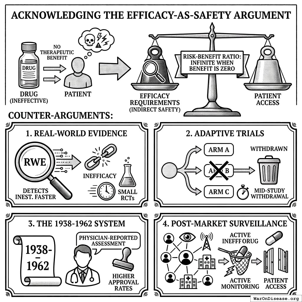 Critique: Without efficacy requirements, pharmaceutical companies will sell snake oil and dangerous drugs. Type I errors (approving bad drugs) will explode.