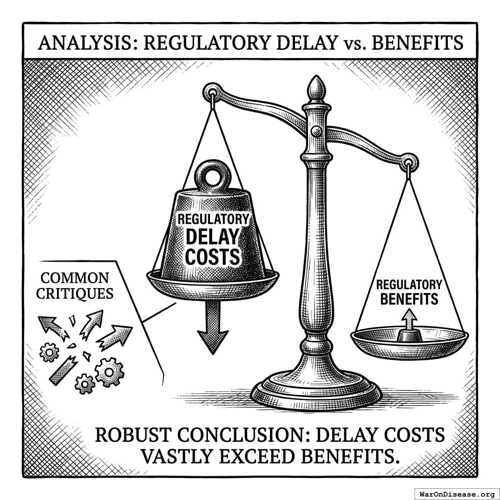 The 3.07k (95% CI: 2.88k-3.12k) ratio demonstrates that these costs dwarf the benefits. The regulatory framework optimizes for bureaucratic risk minimization (avoiding blame for approvals) rather than population health maximization (saving lives).