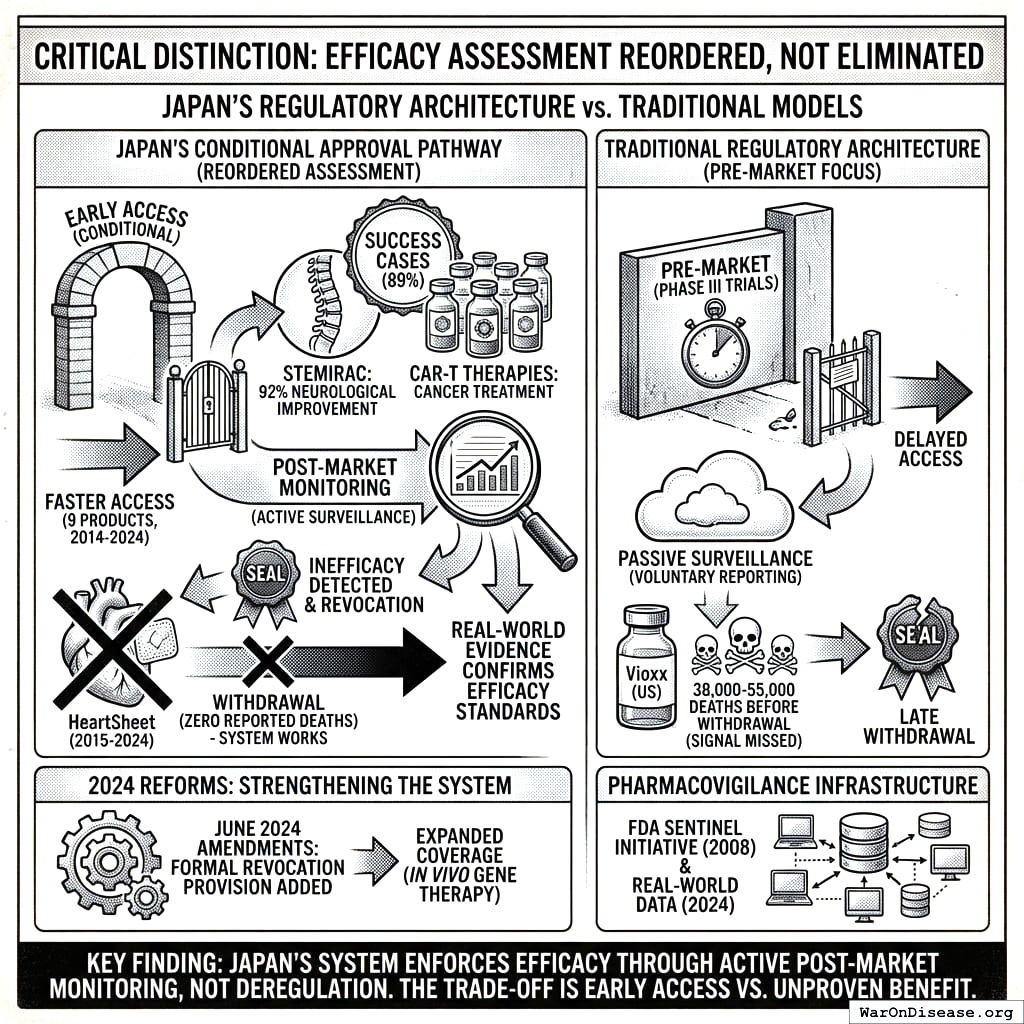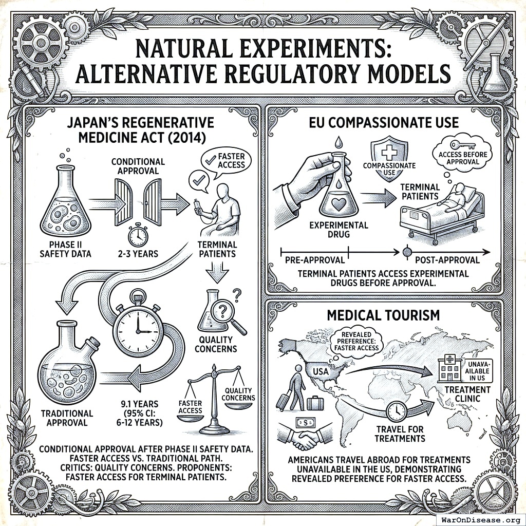• Japan’s Regenerative Medicine Act (2014): Conditional approval after Phase II safety data, with 2-3 year timelines vs. 10.5 years (95% CI: 6 years-12 years). Critics note quality concerns; proponents note faster access for terminal patients with no alternatives.