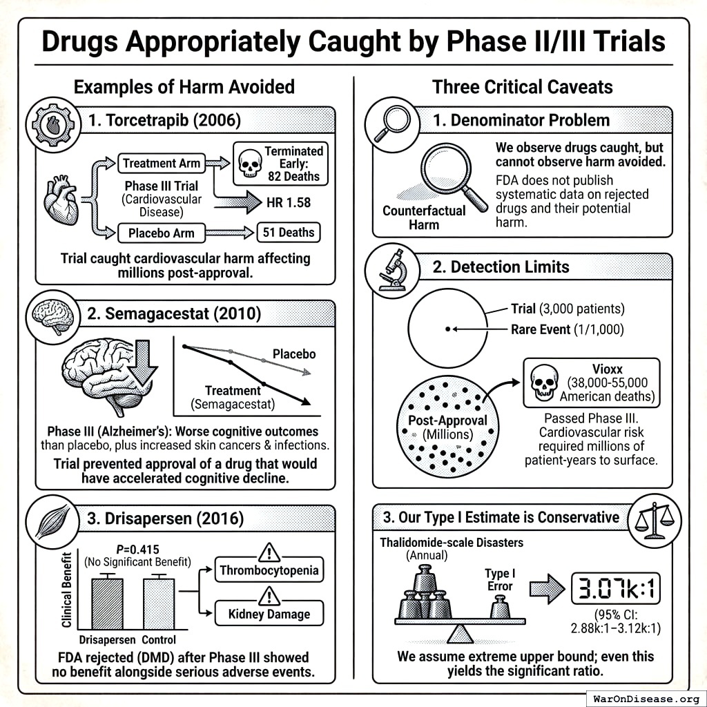 • Vioxx: 38,000-55,000 American deaths156 from cardiovascular events that Phase II/III trials (N≈3,000) were statistically underpowered to detect. The 1-in-1,000 risk required millions of patient-years to surface.