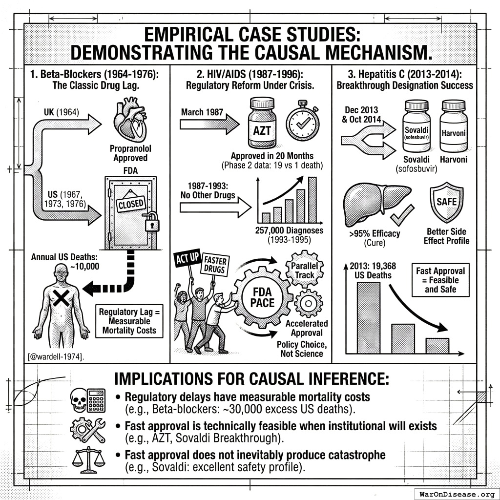 The theoretical claim that regulatory delay causes mortality requires empirical grounding. Three case studies demonstrate the mechanism operates in practice: