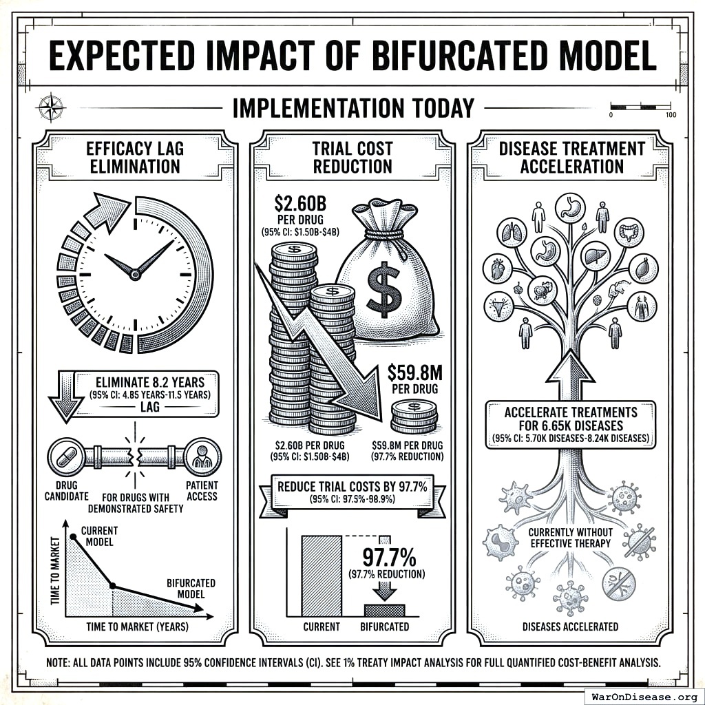 This study quantifies the cumulative mortality and morbidity costs associated with the Unitary Pre-Market Approval (UPMA) model mandated by the 1962 Kefauver-Harris Amendments. By enforcing efficacy testing prior to market entry, the current regulatory framework imposes an average “Efficacy Lag” of 8.2 years (95% CI: 4.85 years-11.5 years) post-safety verification.