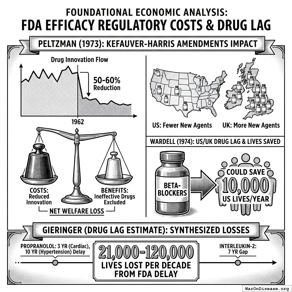 The regulatory cost of FDA efficacy requirements was first rigorously quantified by Peltzman141, who estimated that the 1962 Kefauver-Harris Amendments reduced the flow of new drugs by 50-60%. His analysis concluded that the costs of reduced pharmaceutical innovation substantially exceeded any benefits from keeping ineffective drugs off the market, resulting in net welfare losses to society.
