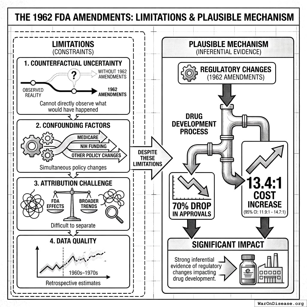 2. Mechanism: Costs increased 13.4x (95% CI: 11.9x-14.7x), real-world trials banned, efficacy requirements added 8.2 years (95% CI: 4.85 years-11.5 years) to development
