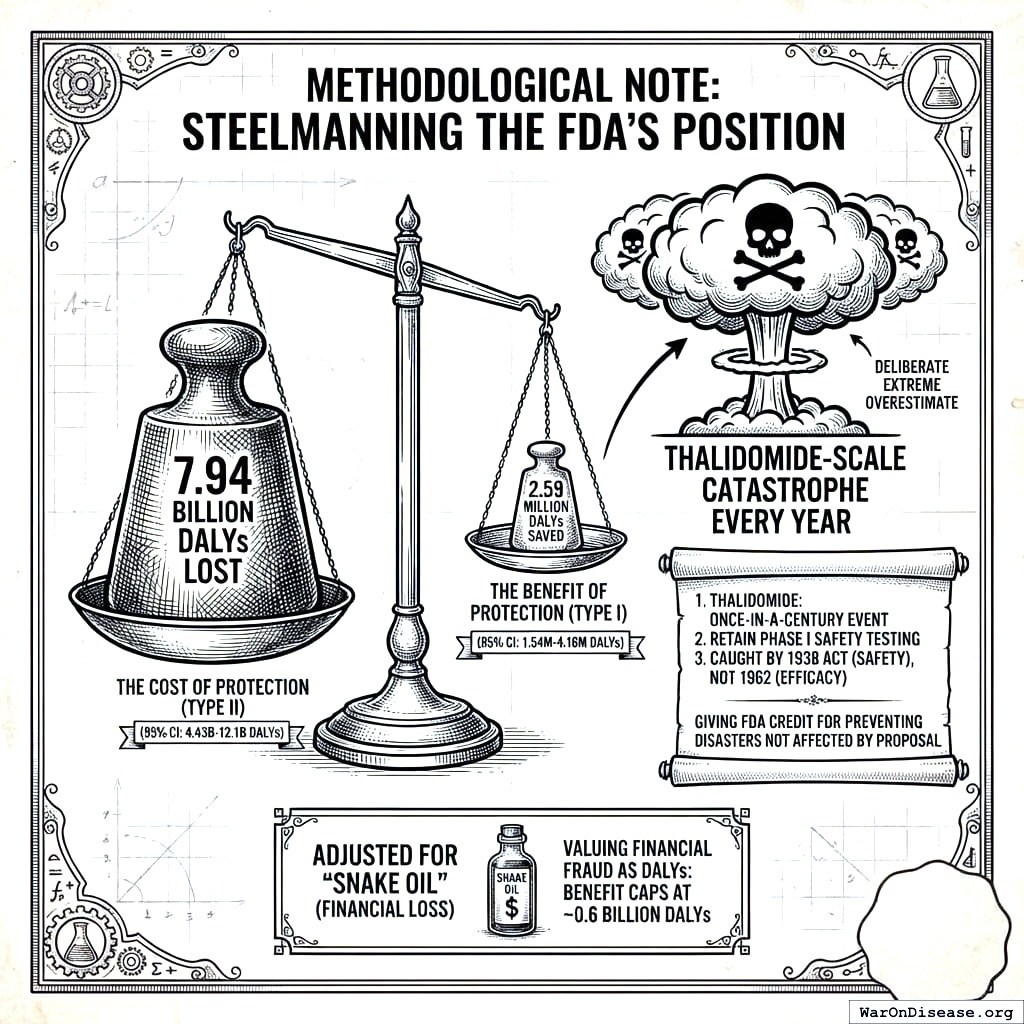 The Type II/Type I ratio would need to drop below 1:1 for the FDA’s approach to be justified on net mortality grounds. Even at 10% regulatory attribution, the ratio remains ~300:1. The conclusion is robust across a wide range of assumptions about confounding.