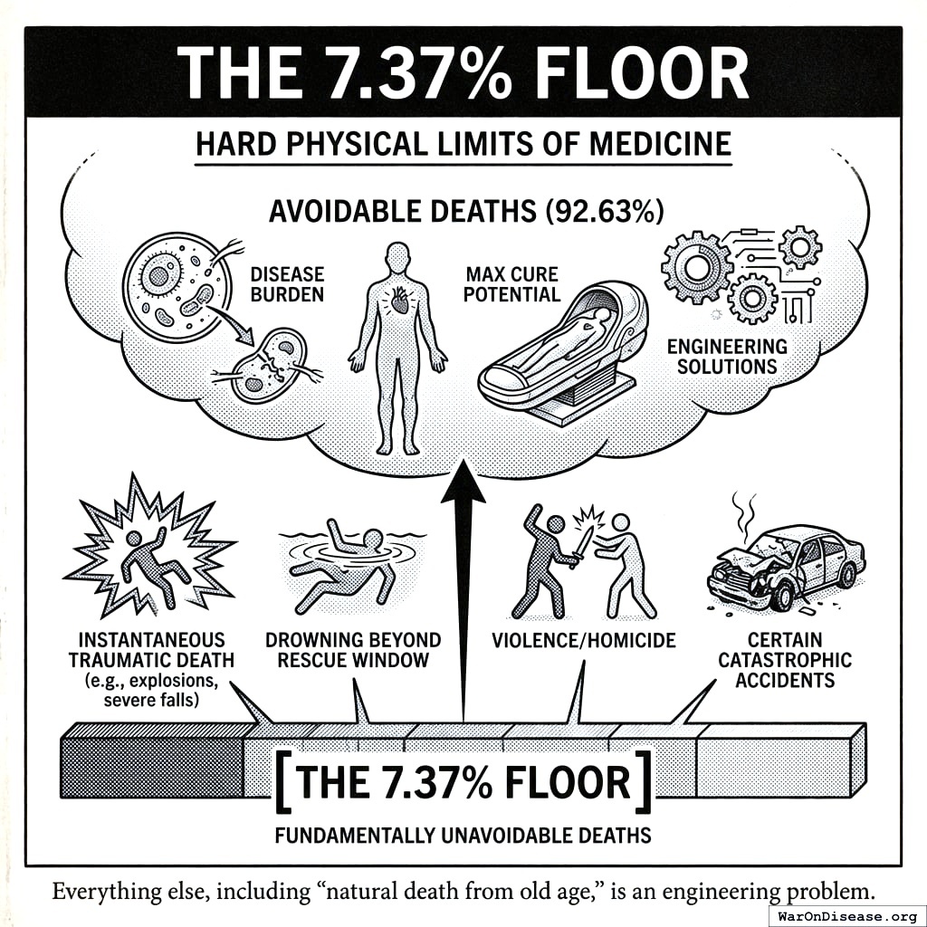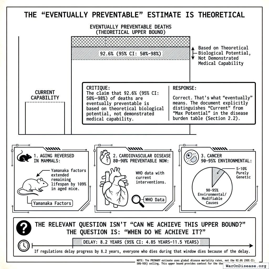 Critique: The claim that 92.6% (95% CI: 50%-98%) of deaths are eventually preventable is based on theoretical biological potential, not demonstrated medical capability.