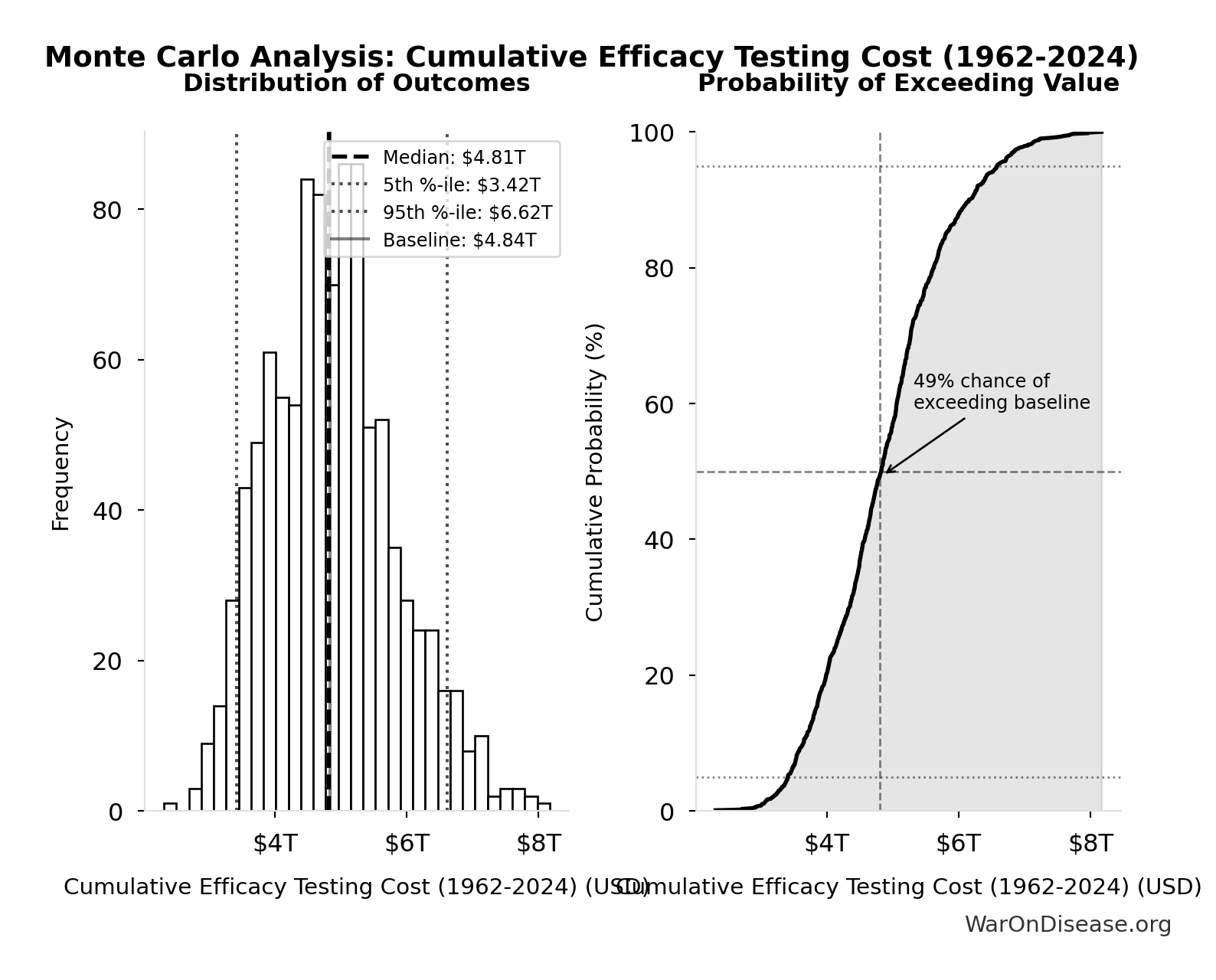Monte Carlo Distribution: Cumulative Efficacy Testing Cost (1962-2024) (10,000 simulations)