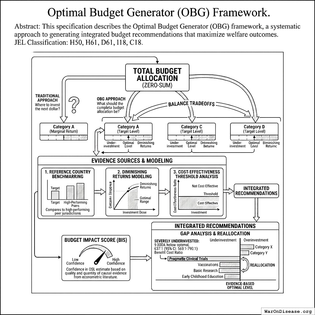 This specification describes the Optimal Budget Generator (OBG) framework, a systematic approach to generating integrated budget recommendations that maximize welfare as measured by two metrics: real after-tax median income growth and median healthy life years.