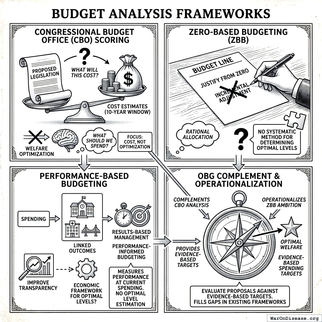 Zero-Based Budgeting. ZBB requires justifying each budget line from zero rather than incremental adjustment. While philosophically aligned with OBG’s goal of rational allocation, ZBB provides no systematic method for determining optimal levels. OBG operationalizes ZBB’s ambition with evidence-based targets.