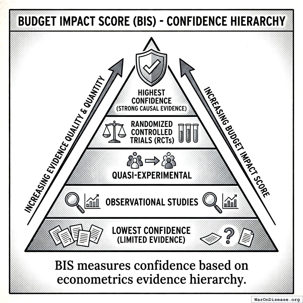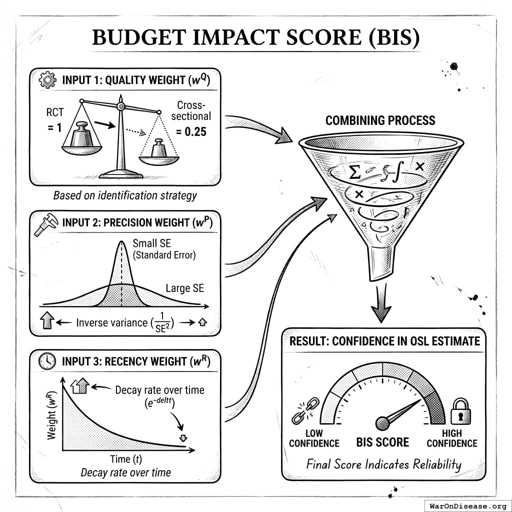 Budget Impact Score (BIS): A 0-1 score measuring confidence in each category’s OSL estimate based on the quality and quantity of causal evidence. Higher BIS indicates more reliable OSL recommendations.
