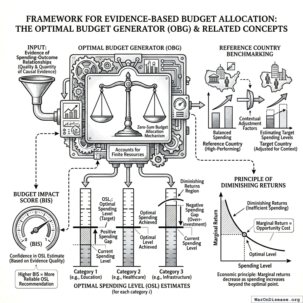 The Optimal Budget Generator (OBG) applies causal inference, diminishing returns modeling, and cost-effectiveness analysis to determine optimal public goods funding levels that maximize two welfare metrics: real after-tax median income growth and median healthy life years. For each spending category, OBG estimates an Optimal Spending Level (OSL) identifying where marginal returns equal opportunity cost.