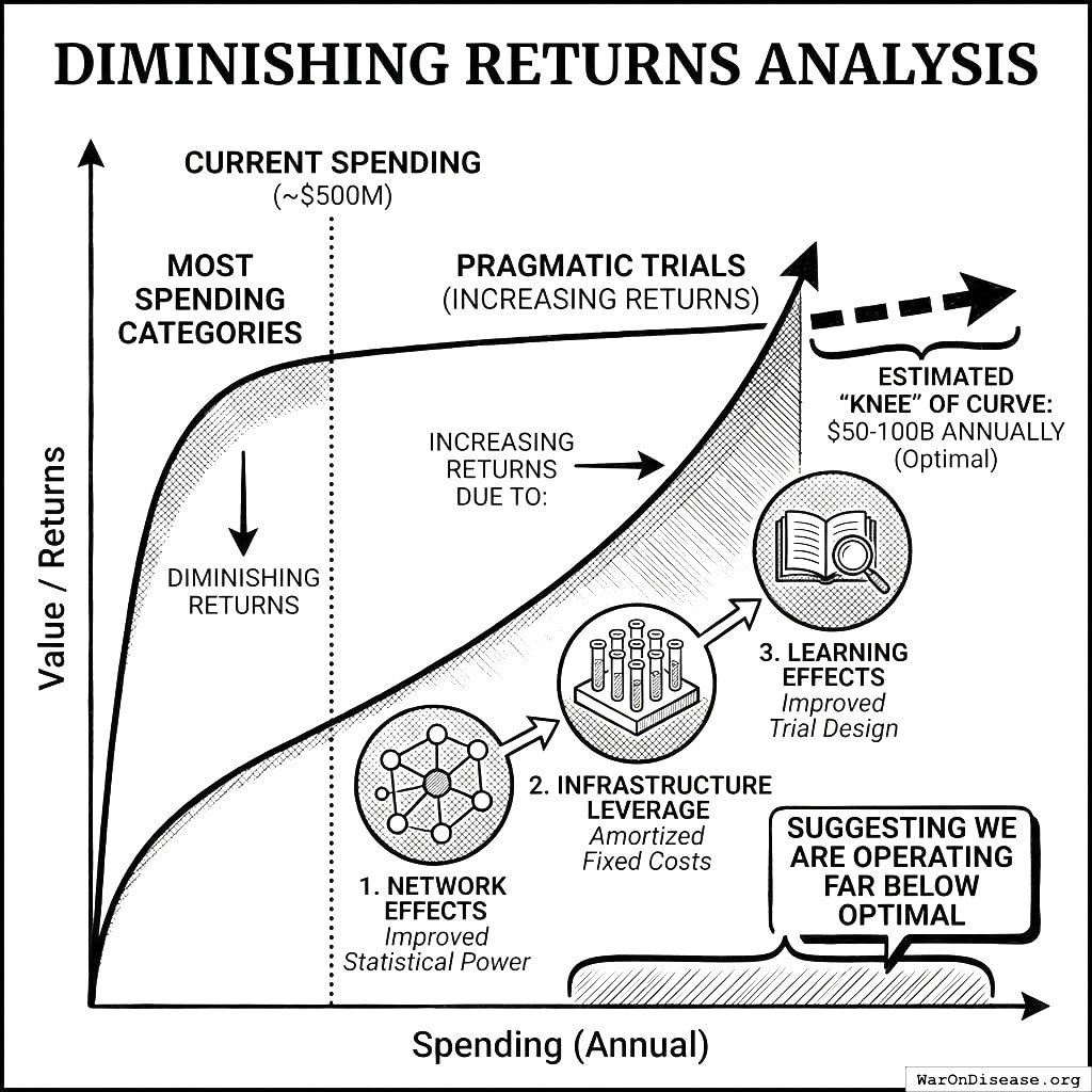 Extreme underinvestment in pragmatic trials: At 9,900% below OSL with 637 (95% CI: 569-790):1 BCR, this is the single largest misallocation in the federal budget (see Section 6 for full derivation)
