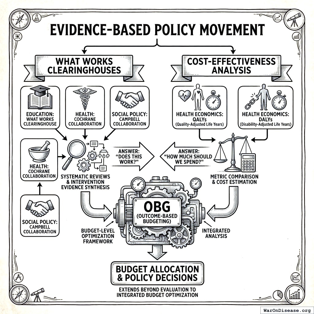 What Works Clearinghouses. Organizations like the What Works Clearinghouse (education), Cochrane Collaboration (health), and Campbell Collaboration (social policy) synthesize intervention evidence through systematic reviews. OBG draws on these evidence bases but extends beyond intervention evaluation to budget-level optimization. While clearinghouses answer “does this work?”, OBG answers “how much should we spend?”