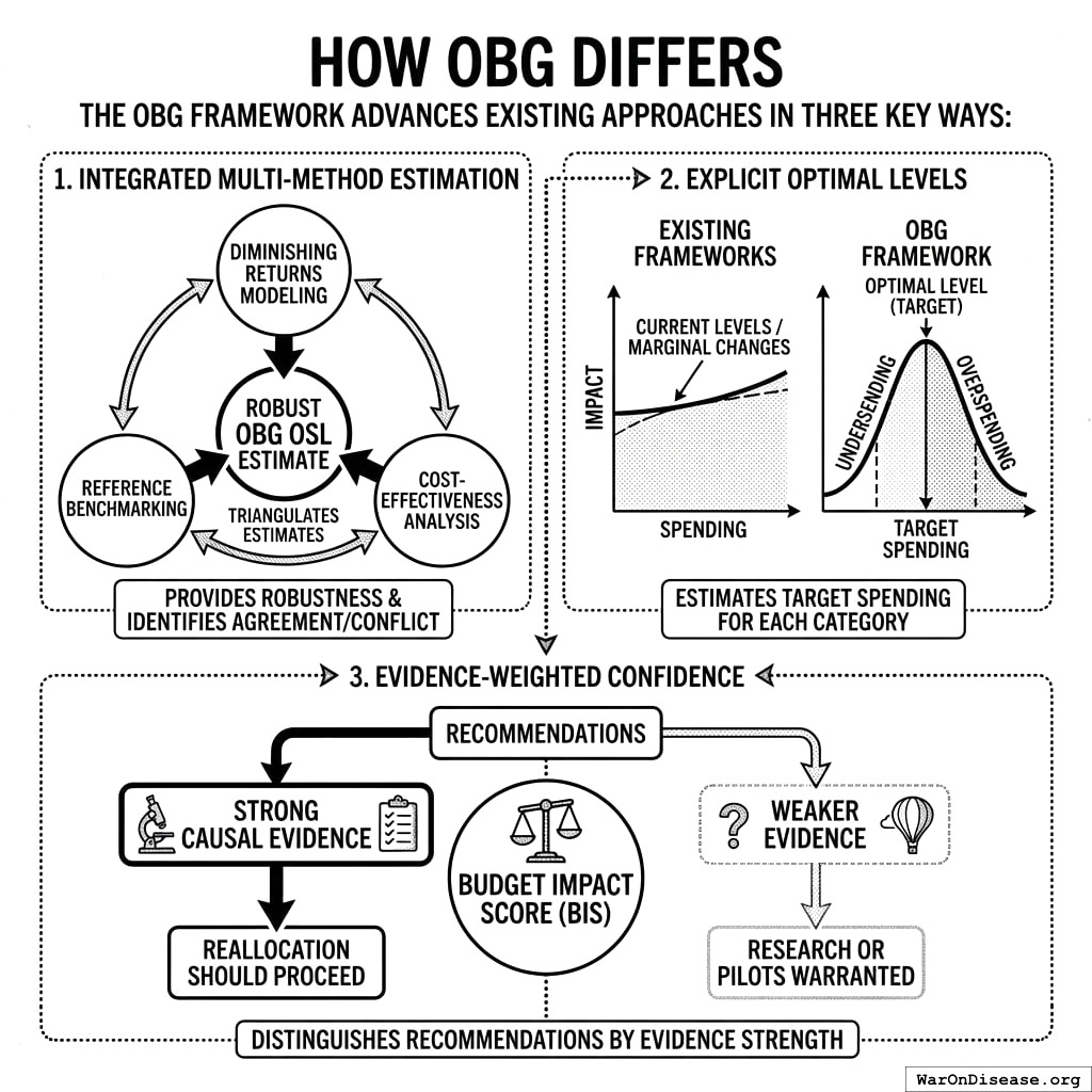 Unlike marginal-return frameworks that ask “where should we invest the next dollar?”, OBG asks “what should the complete budget allocation be?” Each category has a target level - too little means underinvestment, too much means diminishing returns. But unlike the Recommended Daily Allowance for nutrients (where you can meet all targets simultaneously), budget allocation is zero-sum: spending more on one category means less for others. OBG generates integrated recommendations that balance these tradeoffs.