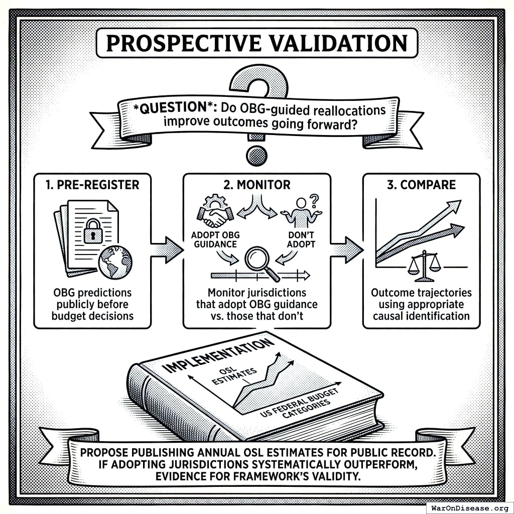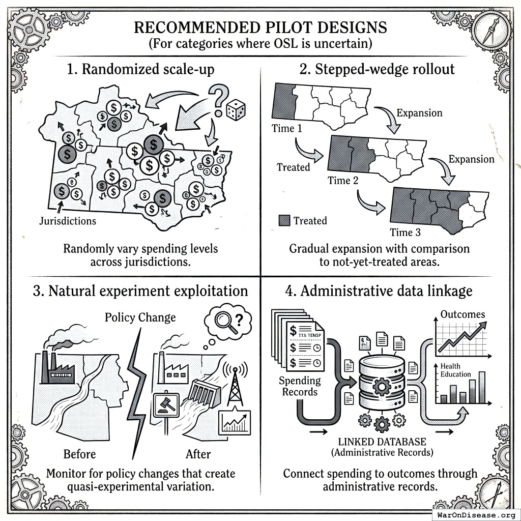 This appendix applies the OBG methodology to the US discretionary budget as an illustrative exercise. “Current” figures reflect approximate FY2024 budget authority. OSL estimates for pragmatic trials, vaccinations, and K-12 education are derived from the worked examples in Sections 5-7. Other OSL values integrate cross-country benchmarking and published cost-effectiveness evidence. BIS scores summarize the strength of the causal evidence.