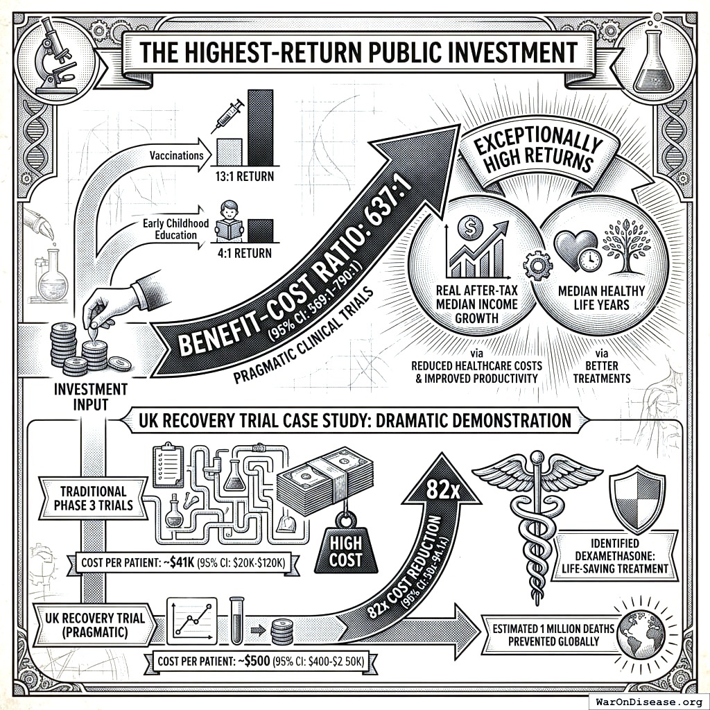 The result: systematic overinvestment in low-return categories and underinvestment in high-return categories. Historical examples demonstrate the scale of missed opportunities: the smallpox eradication campaign returned an estimated 450:1 ROI96, yet similar high-return public health investments remain chronically underfunded.