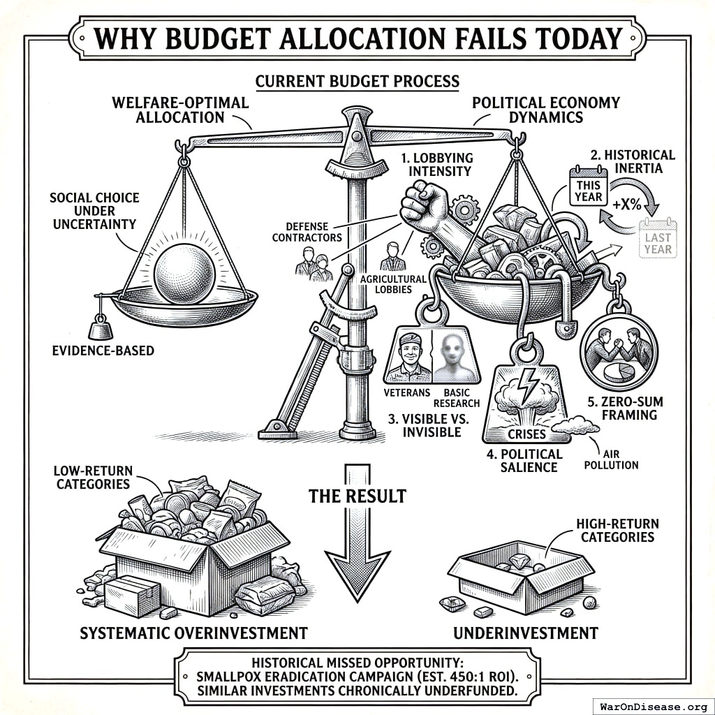 Budget allocation is fundamentally a problem of social choice under uncertainty143. The challenge is not simply technical but institutional: current budget processes systematically diverge from welfare-optimal allocations due to political economy dynamics144,145.