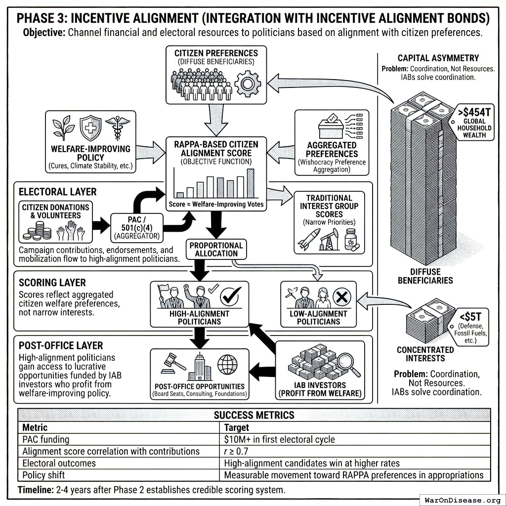 10.5281/zenodo.18203221 Government spending is optimized for lobbying intensity, not net societal value. Programs with 100:1 benefit-cost ratios get billions while programs with negative returns get hundreds of billions. Incentive Alignment Bonds flip this by creating a capital pool that rewards politicians (via campaign support and post-office opportunities) for funding high-NSV programs over low-NSV alternatives. The result: public good becomes private profit for both investors and elected officials.