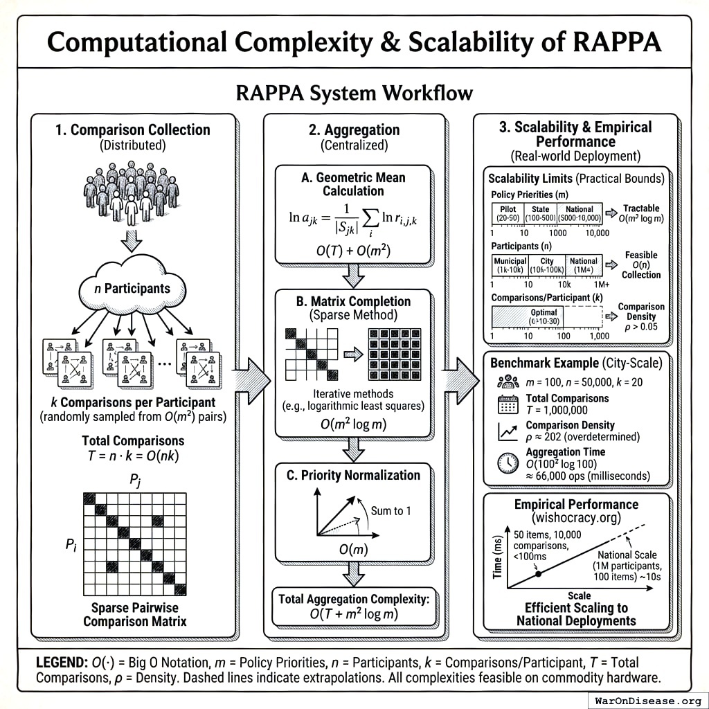 Empirical Performance: The reference implementation at wishocracy.org152 processes 10,000 comparisons across 50 items in under 100ms on standard cloud infrastructure (AWS t3.medium instance). Extrapolating linearly, national-scale deployment (1M participants, 100 items) would require ~10 seconds of aggregation time, negligible compared to voting/deliberation timescales measured in days or weeks.