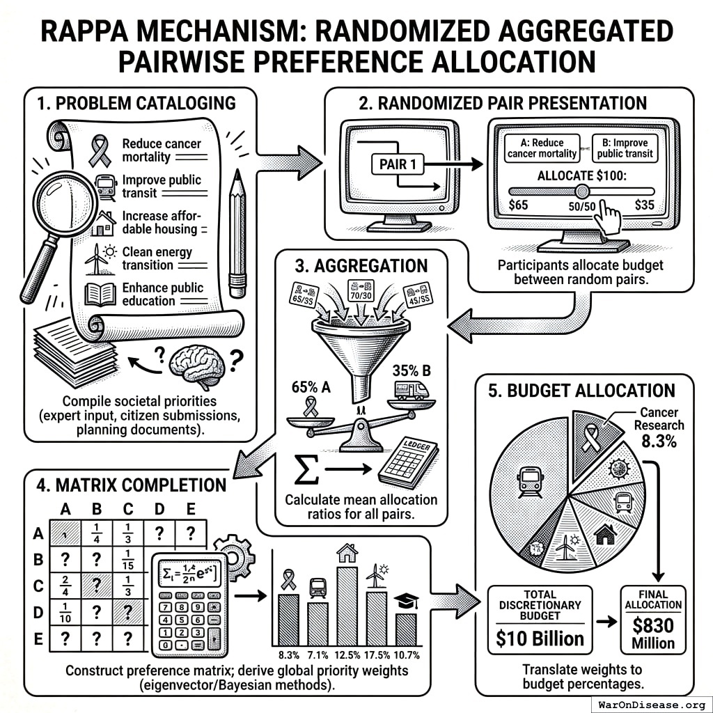 Wishocracy offers a fourth path: a mechanism that harnesses collective intelligence through structured preference elicitation while respecting cognitive constraints, incorporating preference intensity, and maintaining democratic legitimacy. By presenting citizens with simple pairwise comparisons (‘Given $100 to allocate between cancer research and Alzheimer’s research, how would you divide it?’), the mechanism decomposes the impossible n-dimensional comparison into tractable binary choices. Aggregated across millions of such comparisons from thousands of participants, the system converges on a preference ordering that approximates the utilitarian social welfare function under stated assumptions.