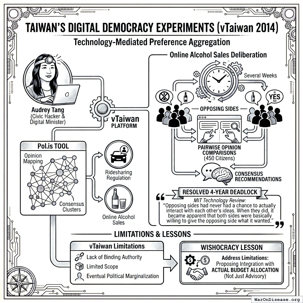 vTaiwan’s limitations (lack of binding authority, limited scope, and eventual political marginalization) provide crucial lessons. Wishocracy addresses these by proposing integration with actual budget allocation rather than advisory recommendations.