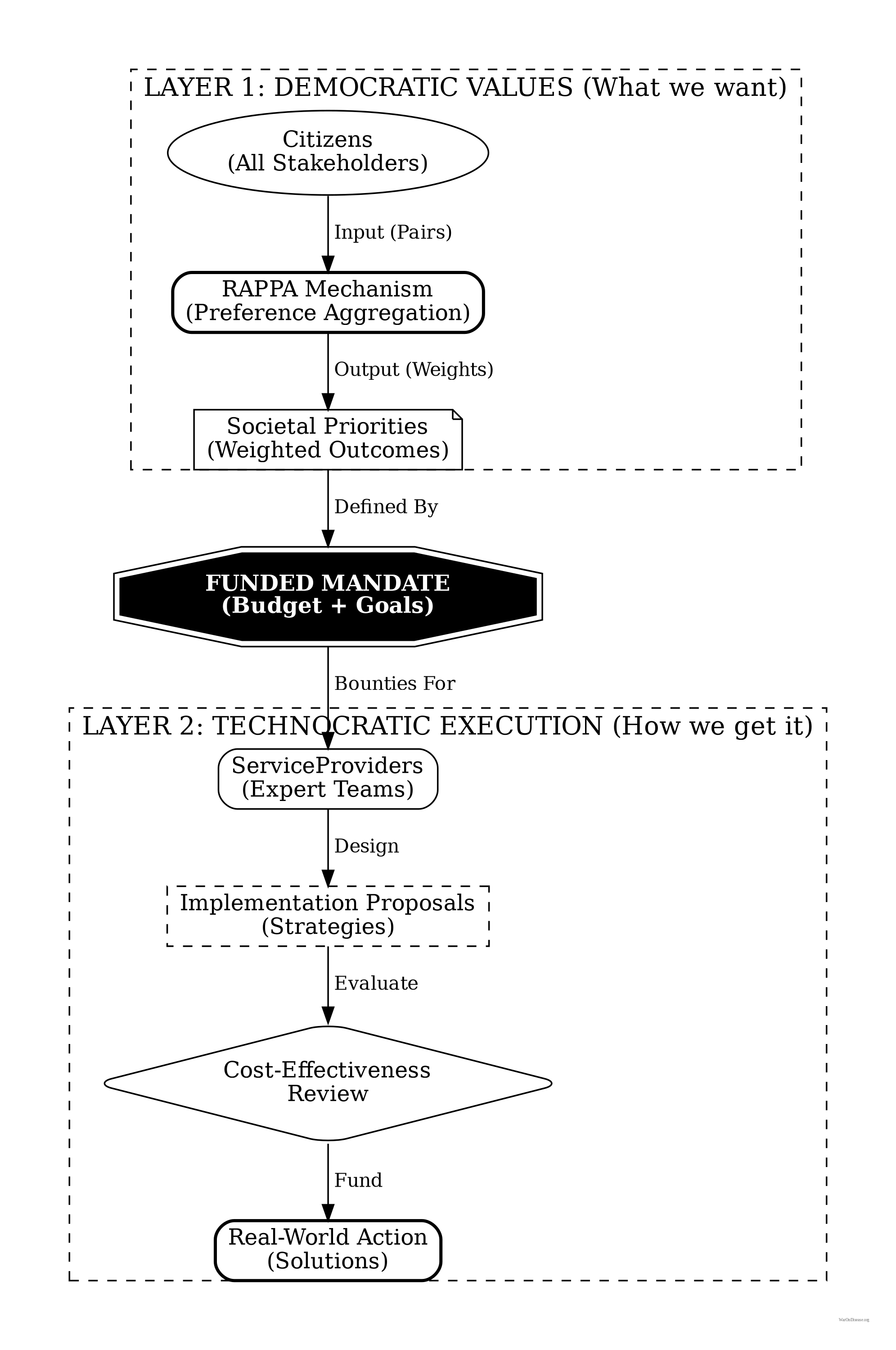 Wishocracy implies a separation of concerns: RAPPA determines what society values (the priority vector \(\mathbf{w}\)), while the implementation of those priorities is handled by a separate layer of competitive problem-solving organizations (see Appendix A: The Solution Layer). This distinction prevents the mechanism from bogging down in technical debates during the preference aggregation phase.