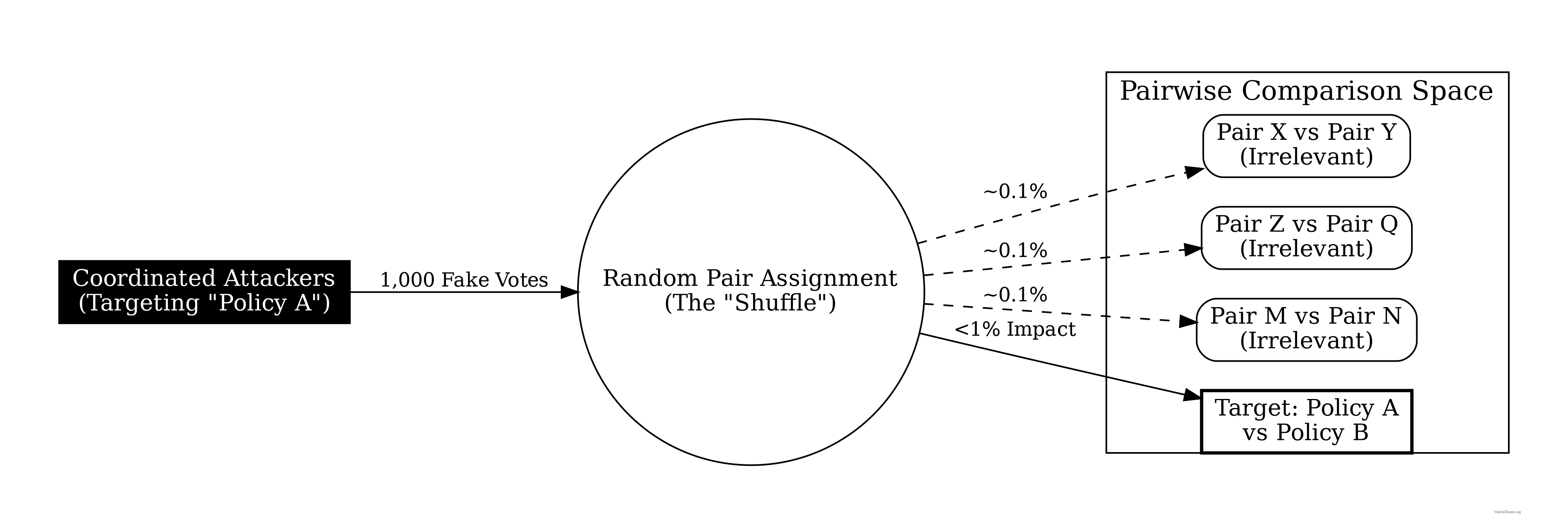 - Aggregation: Millions of other citizens make similar pairwise comparisons. Alice never sees “Medical Research vs. Drug Enforcement,” but the system infers the relationship (Medical Research > Military > Drug Enforcement) through the transitive network of all citizens’ choices.