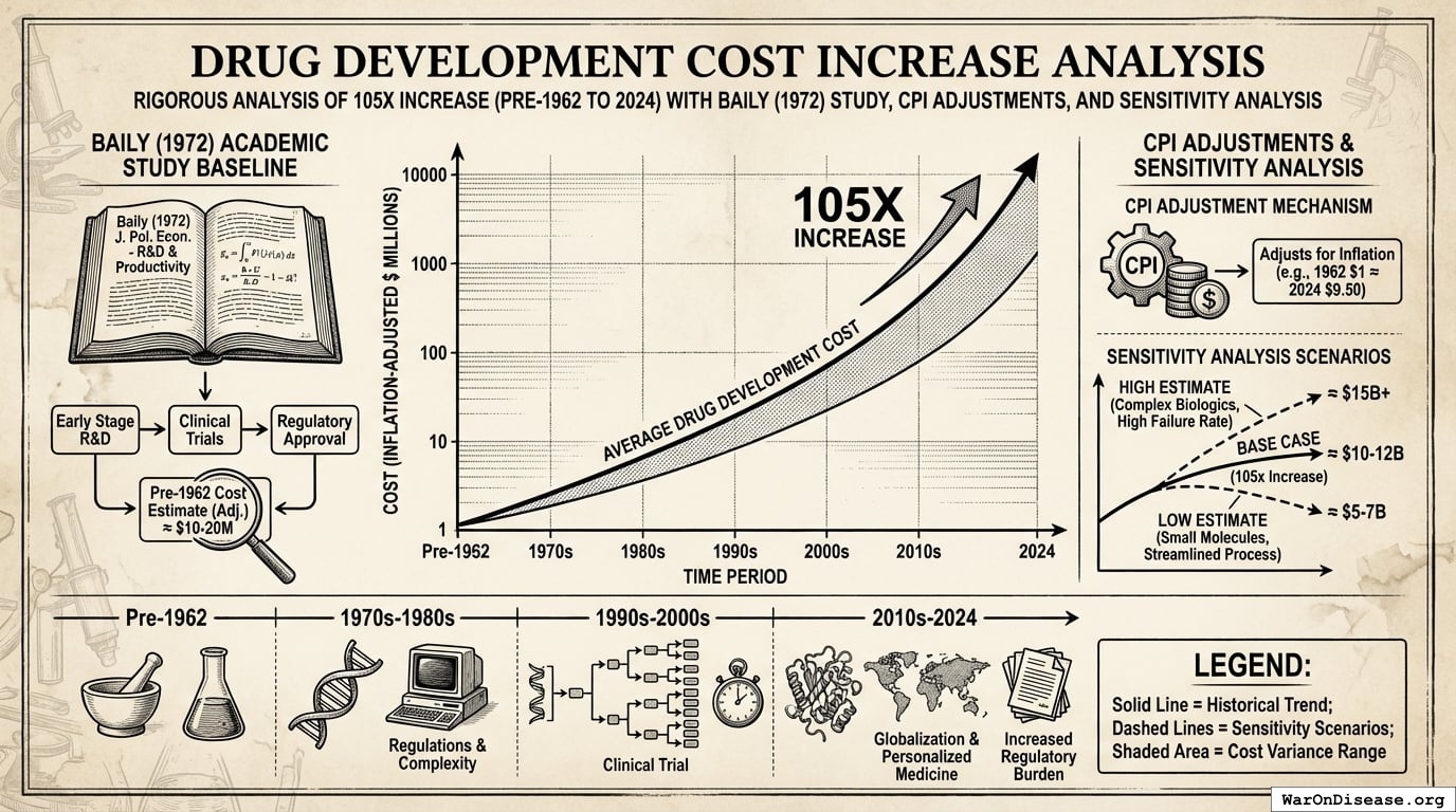 Historical estimates (1970-1985): USD $226M fully capitalized (2011 prices) 1980s drugs: $65M after-tax R&D (1990 dollars), $194M compounded to approval (1990 dollars) Modern comparison: $2-3B costs, 7-12 years (dramatic increase from pre-1962) Context: 1962 regulatory clampdown reduced new treatment production by 70%, dramatically increasing development timelines and costs Note: Secondary source; less reliable than Congressional testimony Additional sources: https://thinkbynumbers.org/health/how-many-net-lives-does-the-fda-save/ | https://en.wikipedia.org/wiki/Cost_of_drug_development | https://www.statnews.com/2018/10/01/changing-1962-law-slash-drug-prices/