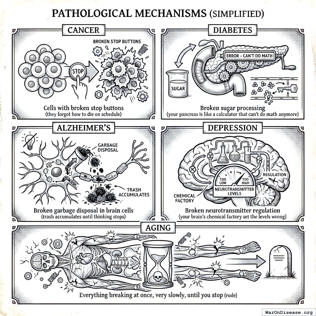 Every disease is just a broken part: cancer is cells with broken stop buttons, Alzheimer’s is broken garbage disposal in brain cells, aging is everything breaking at once very slowly (rude).