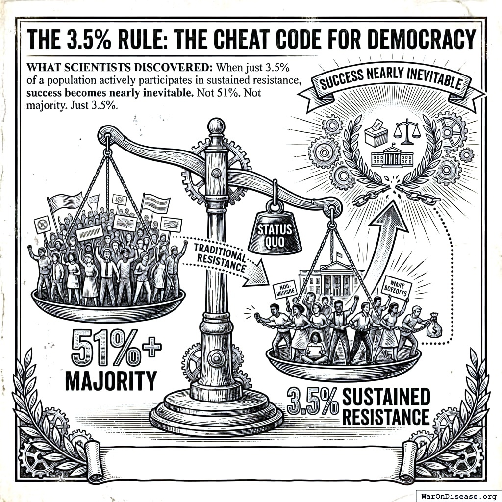 What scientists discovered: When just 3.5% (95% CI: 1%-10%) of a population actively participates in sustained resistance, success becomes nearly inevitable. Not 51%. Not a majority. Just 3.5% (95% CI: 1%-10%).
