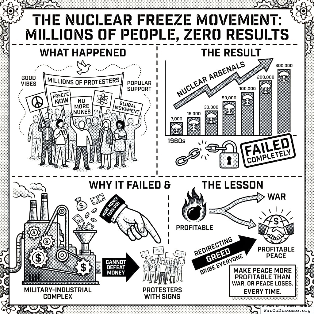 Why it failed: You cannot defeat money with good intentions. The military-industrial complex has more money than God, and protesters have signs. This is why a 1% Treaty156 doesn’t ask nicely; it bribes everyone into compliance. You’re not fighting greed. You’re redirecting it. Morality is lovely. Capitalism is faster.